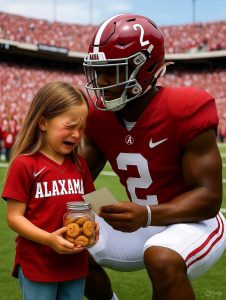 The little girl, wearing her own crimson Alabama jersey, stood outside the gates of Bryant–Denny with a jar of cookies in hand, tears streaming down her face as she realized she still didn’t have enough. Her story, whispered by fans nearby, quickly spread through the crowd until it reached the sideline—where Williams, the five-star wide receiver wearing the iconic number 2 jersey, was warming up.